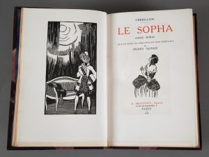 [Curiosa]. CREBILLON. Le sopha. Conte moral. Édition ornée de cinquante-six bois originaux de Sylvain Sauvage. Paris, Briffaut, 1924, grand in-8, reliure demi-maroquin aubergine à coins, dos à nerfs richement orné, double filet doré aux plats,...