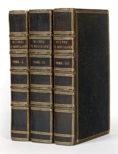 MONTAIGNE (Michel de) Les Essais. Nouvelle édition exactement purgée des défauts des précédentes, selon le vray original. Amsterdam, Anthoine Michiels [Bruxelles, François Foppens], 1659. 3 volumes in-12 de (26) ff., dont un portrait gravé, 468 pp. ; (2) ff., 708 pp. ; (2) ff., 510 pp. et (39) ff. : maroquin noir, triple filet doré, dos orné de filets dorés, dentelle intérieure, tranches dorées (Antoine Chaumont, avec son étiquette).