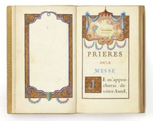 Le manuscrit n'est pas signé mais sa décoration est bien dans la manière habituelle du calligraphe-ornemaniste Jean-Pierre Rousselet. On peut ainsi le rapprocher du manuscrit enluminé à l'usage de la chapelle de Versailles qui a figuré au catalogue de la bibliothèque Henri Marie Petiet (VIII, 1997, n° 9).