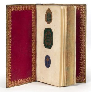 In-12 de (10) ff., 338 pp. , (1) f. : maroquin brun olive, bordure dorée composée de quatre frises à croisillons et fleurettes bordées de filets droits et courbes, roue ornée de rayons courbes dorés disposée dans les angles, cartouche central de forme ovale orné d'une torsade et de compartiments ornementés aux petits fers filigranés, dos orné de compartiments de formes géométriques variées (losangé, circulaire, carré, trilobé) décorés aux fers filigranés, pièce de titre de maroquin rouge fleurdelisée, doublure de maroquin rouge, dentelle intérieure dorée aux petits fers, tranches dorées sur marbrure, étui moderne de chagrin bleu en deux parties (reliure de l'époque).