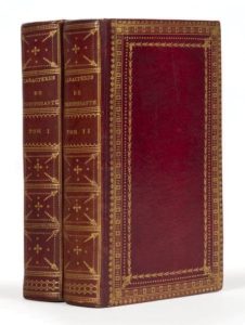 LA BRUYERE (Jean de) Les Caractères de Théophraste ; avec les Caractères ou les Mœurs de ce Siècle. Amsterdam, F. Changuion, 1741. 2 volumes in-12 de (4) ff., 48 pp., 487 pp. ; (2) ff., 580 pp. : maroquin rouge, large dentelle droite en encadrement formée de filets droits et au pointillé et de diverses roulettes, dos lisse orné, roulette intérieure, tranches dorées (reliure vers 1780).