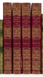 LOUVET DE COUVRAY Les Amours du chevalier de Faublas. Troisième édition, revue par l'auteur. Se vend à Paris, chez l'Auteur, An VI de la République [1798]. 4 volumes in-8 de XVI, 244 pp., 6 planches ; (2) ff., 274 pp., 7 planches ; (2) ff., 307 pp., 6 planches ; (2) ff., 330 pp., la dernière mal chiffrée 230 sans manque, 8 planches : maroquin rouge à long grain, bordure dorée ornée d'un pampre et d'un soleil rayonnant dans les angles, dos ornés de petits fers sur fond à mille points, grecque intérieure, tranches dorées (Bozerian).