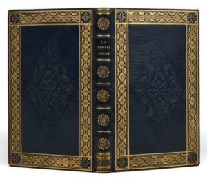 In-8 de (3) ff. et 246 pp. : maroquin bleu nuit à long grain, bordure droite formée de deux doubles filets se croisant aux angles et d'une large roulette, grand cartouche de forme losangée frappé à froid au centre, dos orné de motifs, filets et palettes, encadrement intérieur orné de filets et petits motifs dorés, doublure et gardes de papier moiré vert d'eau, tranches dorées (Lesné).