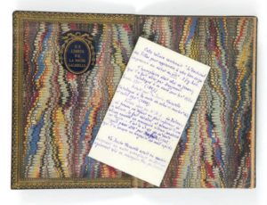 Dans une note autographe à l'encre violette, au verso d'une carte de visite à son nom jointe à la reliure, Pierre Louÿs rapporte que l'exemplaire appartenait autrefois à La Roche-Lacarelle (1888, nº 163) qui l'avait acquis à la vente Yemeniz (1867, n° 1664). Louÿs explique dans quelles circonstances cette parure de Bauzonnet se trouva privée de son texte : “Acheté alors par M. H. B... de Bordeaux qui trouve un défaut au plat inférieur de la reliure, le fait dérelier, et recouvrir d'une reliure nouvelle en maroquin citron janséniste par Cuzin.”