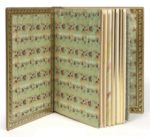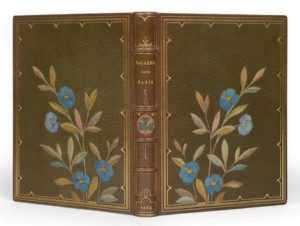 In-4 de (4) ff., 149 pp., (3) ff. : maroquin vert olive, encadrement de filets dorés, plats ornés d'une composition de fleurs au naturel mosaïquées dans divers tons, dos orné, motif floral mosaïqué, encadrement intérieur doré, doublure et gardes de soie brochée à motifs floraux, tranches dorées, couverture, chemise demi-maroquin, étui (Lucien Magnien).