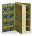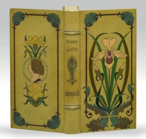 In-12 étroit de (4) ff., 392 pp., (2) ff. : maroquin beige, décor mosaïqué en divers tons de couleurs sur les plats, cadre dessiné par des tiges aux extrémités enroulées et de coquilles dans les angles, orchidacée fleurie au naturel reposant sur deux tritons adossés sur le premier plat, sur le second portrait de profil (Aphrodite) en médaillon placé entre deux fleurs stylisées, dos à deux nerfs portant le nom de l'auteur et le titre à froid, plume de paon au centre, doublure de maroquin bleu persan orné d'un décor à répétition de fleurs stylisées mosaïquées, gardes de soie brochée, tranches dorées sur témoins, couverture et dos, étui en deux parties (Charles Meunier 98).