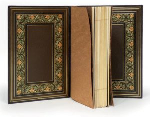 In-8 de (3) ff., VII pp., (1) f., 143 pp. et (3) ff. : maroquin à gros grain aubergine, motif à froid semblant maintenir les nerfs du dos qui se prolongent sur les plats, doublure de maroquin lilas orné d'une large bordure, délimitée par des filets dorés et des listels noirs, et couverte d'une frise de feuilles et grelots, le tout mosaïqué et serti au filet doré, gardes de soie brochée or et ocre, tranches dorées sur témoins, couverture et dos, chemise demi-maroquin bleu, étui (Marius Michel).