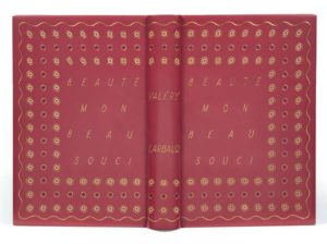 In-8 de 145 pp., (1) f. : box rose, large encadrement se poursuivant sur les deux plats et le dos, composé de trois rangées de pastilles dorées, dont deux mosaïquées de box beige, et bordées par un filet doré ondulé, titre sur les plats en fines lettres dorées, nom de l'auteur au dos, encadrement intérieur à décor rappelant celui des plats, doublure et gardes de moire grenat, tranches dorées sur témoins, couverture et dos, chemise demi-box rose, étui (Creuzevault).