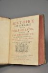 COLONIA Dominique de.HISTOIRE LITTÉRAIRE DE LA VILLE DE LYON, avec une bibliothèque des auteurs Lyonnois, sacrés et profanes, distribués par siècle.LYON, FRANÇOIS RIGOLLET, 1728.Deux tomes réunis en un volume, in-4, de (16) ff., 414 pp., (1) f., 291 pp., pleine reliure de l'époque en basane granité. Dos à 5 nerfs orné de blasons (frottés) dans un encadrement de filets dorés, pièce de titre en maroquin rouge, double filet doré d'encadrement des plats, tranches dorées, roulette dorée sur les chasses. Petite trace de mouillure claire ancienne dans la marge inférieure des 20 premières pages du tome II, ex-libris ancien manuscrit sur le titre.Édition originale, rare, illustrée de sept planches (sur 8 ?) hors - textes dont la plupart sont dépliantes. Vignettes de titres aux armes de la ville de Lyon. Pages de titre en rouge et noir.