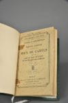 LONGUEVILLE Adhémar de.MANUEL COMPLET DE TOUS LES JEUX DE CARTES. Suivi de l'art de tirer les cartes et d'un recueil de patiences.PARIS, FLAMMARION, s. d.Un volume, in-12, de (2) ff., 209 pp., pleine reliure en basane verte. Dos à 5 nerfs orné et doré portant le titre doré, décor personnalisé sur fond rouge dans un cadre doré sur le premier plat, couverture conservée. Bon exemplaire.Ouvrage recherché.
