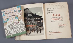 [Japon]. Scènes du théâtre japonais. L'école de village (Terakoya). Drame historique en un acte. Traduction du Dr Karl Florenz. Tokyo, Hasegawa, 1900, in-4, cartonnage éditeur illustré, couture à la japonaise, jaquette (jaquette déchirée,...