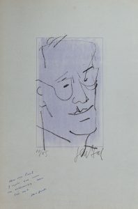 GEN-PAUL (Eugène Paul dit). Portrait de Marcel JOUHANDEAU. Pointe ; Lithographie sur papier vergé azur signé en bas à la mine de plomb et justifiée 14/65. E.A.S. de Jouhandeau à Paul [Chambrillon]. " J'espère que vous me reconnaissez. Moi...