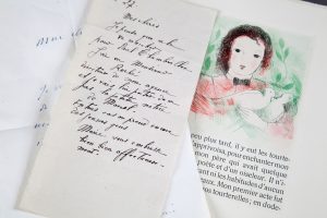 Cet exemplaire comporte un envoi autographe signé de Jouhandeau à Paul Chambrillon, et une lettre signée du même, du 13 juin 1956, disant qu'il lui joint " cette belle lettre de Marie Laurencin où il est question de vous. Sans doute aurez-vous quelque joie à la posséder ". Ladite lettre autographe de Marie Laurencin est jointe (1 page sur un feuillet de 21 × 10 cm). Datée " le 27 " [mai 1956 ?], elle est très vraisemblablement adressée à Elise et Marcel Jouhandeau : " Mes chéris, je pense que cela va marcher pour Paul Chambrillon. J'ai vu monsieur Roché directeur de mon agence et je vais lui porter de ce pas la petite notice de Marcel. En tous cas on prend encore des jeunes gens. Marie vous embrasse bien affectueusement ".