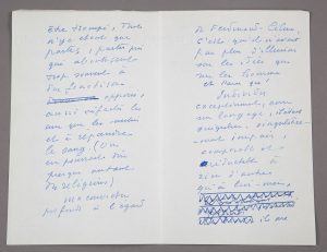 que nos erreurs ne reposent pas sur un intérêt, qu'elles n'ont pas été dictées par un bas calcul, surtout si elles n'ont réussi qu'à nous ruiner et à faire de nous des martyrs, elles n'ont rien de regrettable […]. Ma conviction profonde à l'égard de Ferdinand-Céline, c'est qu'il n'avait pas plus d'illusions sur les idées que sur les hommes et parce qu'individu exceptionnel, comme son langage, il était singulier, singulièrement impair, comparable et réductible à rien d'autre qu'à lui-même [2 lignes biffées], il me semble mériter d'être respecté à l'égal de certains cyniques de l'Antiquité. ".