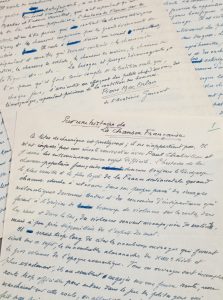 MAC ORLAN (Pierre). Sur une histoire de la chanson française. Manuscrit autographe signé, sans date [vers 1960], 4 pages in-4 (quelques mots biffés). Manuscrit très probablement inédit, rédigé à la demande de Paul Chambrillon, qui avait en...