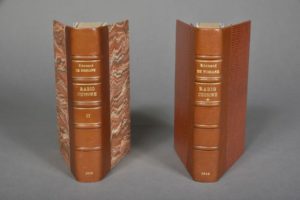 POMINANE E. DE, Radio-cuisine : chroniques gastronomiques diffusées par T. S. F. Paris, Albin Michel, 1949 et 1938, 2 volumes in-8, demi-reliure den chagrin marron, dos à cinq nerfs portant les titres dorés, couvertures et un dos conservés.