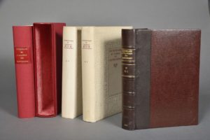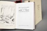 LOT : Dictionnaire de l'Académie des gastronomes. Quatre volumes aux éditions PRISMA, 1962, trois volumes en reliure éditeur gaufrés, titre en rouge sur le premier plat, chemise en toile rouge et étui de luxe éditeur bordures peau et un volume en demi-reliure en chagrin noir portant le titre doré. Un Tome 1 et trois Tome 2.