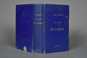 GOUFFE Jules, Le livre de cuisine comprenant la cuisine de ménage et la grande cuisine avec 4 planches en chromolithographie et 182 gravures sur bois, 5ème éditions Paris Hachette, 1881, un fort in-4, reliure éditeur, titre doré sur le premier plat, quelques feuillets détachés, piqûres sur quelques feuillets.