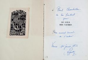 livre, Céline reprend la parole ". Bel envoi daté et signé de l'auteur : " A Paul Chambrillon, un bon fauteuil pour Le Gala des vaches. Bien amical souvenir de l'auteur. Vence, 1er janvier 1954 ". Ex-libris Paul Chambrillon.