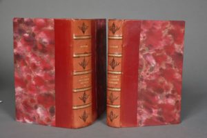 La Fleur de la Cuisine Française Où L' On Trouve les Meilleures Recettes des Meilleurs Cuisiniers, Patissiers et Limonadiers de France, Paris, Éditions de La Sirène, 1920, deux volumes in-8, demi-reliures en basane rouge, dos à nerfs très ornés et dorés portant les titres dorés, couvertures conservées, dos uniformément éclaircis, vignette ex-libris.
