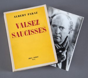 PARAZ (Albert). Valsez saucisses. P., Amiot Dumont, 1950, in-8 broché (dos lég. passé, pli sur la couv., bon ex.). E.O., tirage sur papier courant. Est joint un portrait photographique de Paraz (retirage).