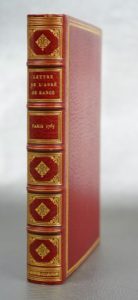 13,5 par 21 cm. Plein maroquin bordeaux, dos 5 nerfs, caissons ornés, triple filet d'encadrement des plats, double filet sur les coupes, cadre intérieur dans le même maroquin, avec un riche décor à la roulette, toutes tranches dorées. Reliure du 19ème siècle, signé JOLY Fils. Parfait état de la reliure. Deux derniers feuillets légèrement brunis, sinon parfait état intérieur.