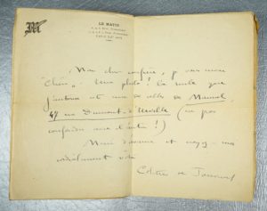 Une sur papier à en-tête du journal LE MATIN, répondant à une demande de photo, signée Colette de Jouvenel
