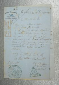 20 courriers sur papier bleu à en-tête imprimé de la Loge, datées entre 1864 et 1876.