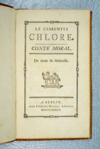(Catherine II de Russie) : Le Czarewitz Chlore, conte moral, de Main de Maîtresse. Berlin, Frédéric Nicolai, 1782. Un volume.