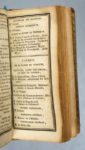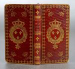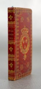 5 par 10,5 cm. Plein maroquin rouge d'époque, roulette dorée de fleurs de lys en encadrement sur les plats, écoinçons couronnés aux angles, armes de LOUIS XVIII au centre, dos lisse orné de motifs dorés dont fleurs de lys, roulette sur coupe, tranches dorées. Plats intérieurs en maroquin noir, avec le même encadrement et les mêmes écoinçons que sur les plats extérieurs. Coins légèrement usés, sinon très bon état de la reliure.