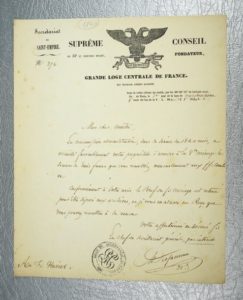 Un ensemble de 14 documents (1840-1890) émanant du Suprême Conseil, de la Grande Loge Centrale de France, lettres manuscrites la plupart du temps sur papier à en-tête.