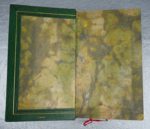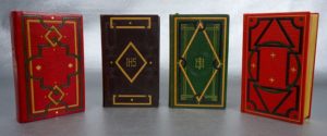 10,5 par 18 cm. Edition en latin, publiée en deux couleurs sur un papier très fin (chaque volume fait près de 1200 pages). Plein maroquin (noir, rouge, vert, orange) avec des plats supérieurs mosaïqués de motifs géométriques, toutes tranches dorées, encadrement intérieur en maroquin, avec un filet doré et un filet à froid. Magnifique reliure signée NOGUÈS. Très bel état de cette reliure comme de tout l'ouvrage (quelques rousseurs sur les pages de garde).