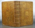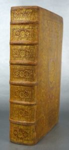 Superbe reliure d'époque plein veau havane 6 nerfs, doré trois tranches. Caissons richement ornés. Très riche décor aux petits fers, avec au centre de chaque plat des armoiries d'une grande finesse partagées entre trois familles : CHABRE (Auvergne), CORNABE (Vevey), et MOL (Artois). Un exemple rare d'une reliure dite à l'éventail, à cause des fers disposés en éventail aux quatre coins des plats.