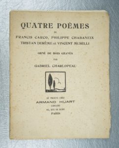CARCO (Francis), CHABANEIX (Philippe), DERÈME (Tristan) et MUSELLI (Vincent) : Quatre poèmes ornés de bois gravés par Gabriel CHALOPEAU. Paris, Armand Huart, 1923. Un volume.