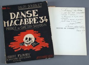 SOUPAULT (Ralph). Danse macabre 34. Préface de Gaëtan Sanvoisin. Paris, Floury, 1934, in-4, [3] f., 50 p. d'illustrations, [3] f., broché, couv. illustrée en rouge et noir (petits accrocs aux bords de la couv., petite auréole en marge des...