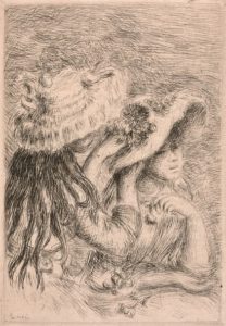 UN DES 150 EXEMPLAIRES NUMÉROTÉS SUR JAPON, renfermant six planches supplémentaires, dont 2 en couleurs et 2 états de la pointe-sèche originale (noir et bistre) : Le Chapeau épinglé (La fille de B. Morisot et sa cousine), Delteil, 8.