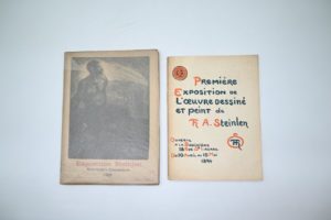 Joint : Première Exposition de l’oeuvre dessiné et peint de Steinlen à la Bodinière. 1894. Très jolie plaquette à laquelle on joint 3 l. a. s. adressée par Steinlen à Rodolphe Salis concernant un différend au sujet d’un prêt de dessins de l’époque du Chat Noir devant figurer à l’exposition. Le refus de Salis entrainera la rupture de leurs relation amicales.