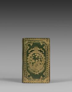 Cartes repliées de la France et des environs de Paris. Ce délicieux almanach, recouvert d’une reliure en maroquin vert d’une parfaite fraîcheur, dont les plats sont décorés de fers copiés de sujets de Moreau le jeune pour les Chansons de Laborde. Le premier : berger et bergère sous un arbre porte en lettres dorées la légende L’Heure du Berger ; le second : jeune homme agenouillé sous un balcon et surpris par son amant porte Les sollicitations pressantes.