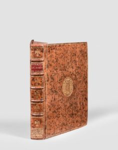 BELLIN, ingénieur de la Marine. Description géographique et historique de l’Isle de Corse, pour joindre aux Cartes et Plans de cette Isle. À Paris, de l’imprimerie de Didot, 1769. In-4, veau granité, dos à 4 nerfs orné avec pièces d’armes et titre sur pièce vieux rouge, encadr. de 3 fil. dorés sur les plats, armoiries au centre, tr. r. (Rel. anc.).