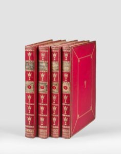 CERVANTES (Miguel de). El Ingenioso Hidalgo Don Quixote de la Mancha. Madrid, don joaquin ibarra, académia reale, 1780. 2 parties en 4 volumes in-4 (297 x 233 mm). Maroquin rouge cerise, 2 jeux de 3 filets dorés sur les plats, fleur. d’angles dor., vase doré au centre, dent. intér., dos orné de filets et fleurons, pièces de maroquin vert, tranches dorées (Reliure de l’époque).