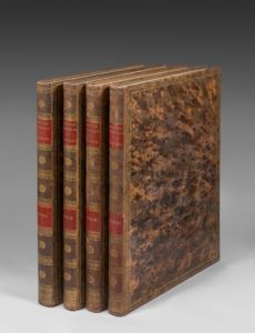 LABORDE (Alexandre Louis Joseph, comte de) (1774-1842). Voyage pittoresque et historique de l’Espagne. Paris, Pierre Didot l’aîné «avec des caractères de Bodoni», 1806-1820. 2 tomes en 4 volumes in-plano (585 x 437 mm), veau marbré, dos à faux nerfs avec pièces de titre et tomaison en maroq. rouge, double encadr. sur les plats, dent. intér. et pointillé dor. sur les coupes, (Rel. de l’époque). Avec les faux-titres. Vignettes gravées sur les titres, frontispice gravé, 272 feuillets avec 349 planches gravées de Moulinier, Liger, Dutailly, Laborde, Rousseau, Vauzelle, Vivant Denon, etc... et 2 cartes doubles de l’Espagne et du Portugal.