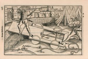 Édition très rare de cette traduction faite par Volcyre de Seronville. Le traité de Végèce est suivi de quatre autres, par Elien, Frontin, etc.. Ces traités sont ornés de 124 figures gravées sur bois, de la grandeur des pages. Toutes les machines de guerre, de la plus classique à la plus insensée, sont représentées, généralement en cours d’utilisation, avec leurs servants, devant une scène.