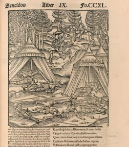 Virgile imprimé à Strasbourg, 1502, par Grünenger, dit Brunet. Les héros de Virgile paraissent en costumes du Moyen Age. Ces figures sur bois sont en très belles épreuves et l’exemplaire est admirablement conservé. (Petit manque au Livre II, fol. LVII.).