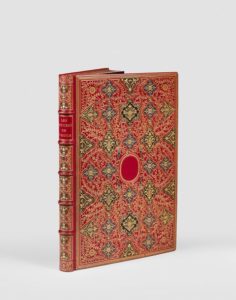 Exemplaire grand de marges et d’une conservation parfaite, dans une ÉCLATANTE RELIURE MOSAÏQUÉE ET DOUBLÉE DE LORTIC, imitation des reliures à la fanfare, exécutée vraisemblablement pour une exposition et CONSIDÉRÉE COMME UN DES CHEFS-D’OEUVRE EXÉCUTÉS PAR CE GRAND MAÎTRE RELIEUR.