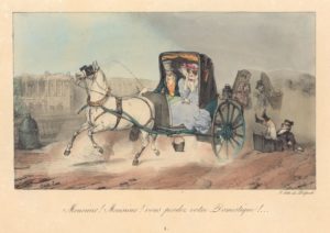 Suite complète et très rare d’une couverture et 6 très jolies lithographies originales d’ Eugène Lami, avec Chevaux et Voitures, coloriées à l’époque et d’une grande fraîcheur.