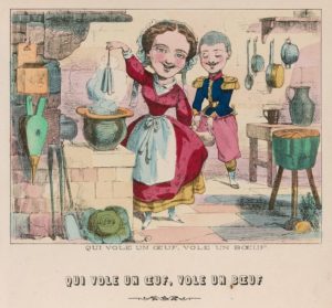 renferme une grande lithogr. volante coloriée représentant un intérieur du temps. La boîte est à 6 compartiments avec au centre une psyché en palissandre avec haut cintré, reposant sur deux pieds mobiles. Dans le compartiment de droite quatre femmes et deux fillettes en pied, lithogr. découpées et coloriées. Dans celui de gauche 30 costumes variés pour femmes (24) et fillettes (6). Dans le bas à droite et à gauche 2 petites boîtes en carton, dans l’une 4 pieds garnis de velours vieux rouge et vert, destinés à supporter et tenir debout les personnages habillés, dans l’autre 24 ravissantes petites coiffures.