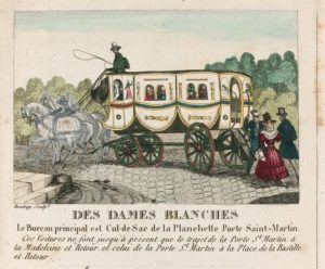 Grande planche (570x435mm) plusieurs fois repliée, contenant le texte gravé des différents itinéraires des voitures publiques de Paris, et des tarifs. Cette pl. est illustrée en tête de 4 voitures avec personnages, gravées par Boutray et finement coloriées à l’époque: Omnibus, Dames blanches, Tricycles, Ecossaises. Suit une Table alphabétique des rues de Paris, des lieux publics, etc…(44 pp.).