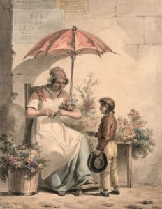 SUITE COMPLÈTE ET RARISSIME de 10 lithographies incunables, numérotées de I à X et coloriées à l’époque : Fondeur de cuillers d’Etain – Marchand de peaux de lapins - Marchande de Chiffons et de vieux Chapeaux – Marchand de paniers – Marchand de tisanne – Marchande de Cerises – Porteur d’eau – Marchand de Balais – Repasseur de Ciseaux – Marchand de Vulnéraire Suisse.