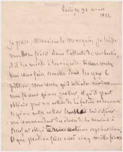 L.A.S. à M. le marquis (de Clermont-Tonnerre). Paris, 31 mars 1822. 2 pp. ½ bi-feuillet in-4. Très belle lettre de recommandation de Chateaubriand en faveur de son beau- frère, le comte du Plessix-Parscau, pour qui il sollicite le grade de contre-amiral : (…) Je laisse mon beau-frère dans l’attente de vos bontés, et il les mérite à tous égards (…). Vous verrez qu’il sollicite moins une faveur qu’une justice et qu’il peut obtenir par un article de la fatale ordonnance ce qu’un autre article semble lui refuser : un commandement des élèves de la marine à Brest (…). Chateaubriand dénonce ses appointements : Que peut-on faire avec cinq mille francs (…). Mon malheureux beau-frère a achevé sa ruine à ce métier et il va être obligé de vendre son dernier sillon. Le grade de contre-amiral le ferait vivre et serait une faible récompense de ses longs et fidèles services. Le Roi connaît M. du Plessis-Pascau et l’aime. Je ne crains pas le Roi pour lui, mais vos bureaux où ont été fabriquées les ordonnances à la St-Cyr, et qui sont remplis des ennemis des officiers de l’ancienne marine (…).