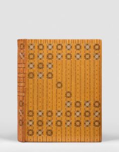 CARCO (Francis). Images cachées. Lithographies de Luc-Albert Moreau. Paris, Éditions de la Roseraie, 1928. Grand in-8, rel. pleine maroquin jaune or, plats et dos couverts de rangs de fil. dor. droits ou en chaînette et de fil. bruns, doublé de maroq. noir dont l’encadr. doré est un rappel du décor des plats, gardes de soie noire, tête dorée, n. r., couverture cons., enveloppe à dos et rabats de maroq. n., étui (Gruel).